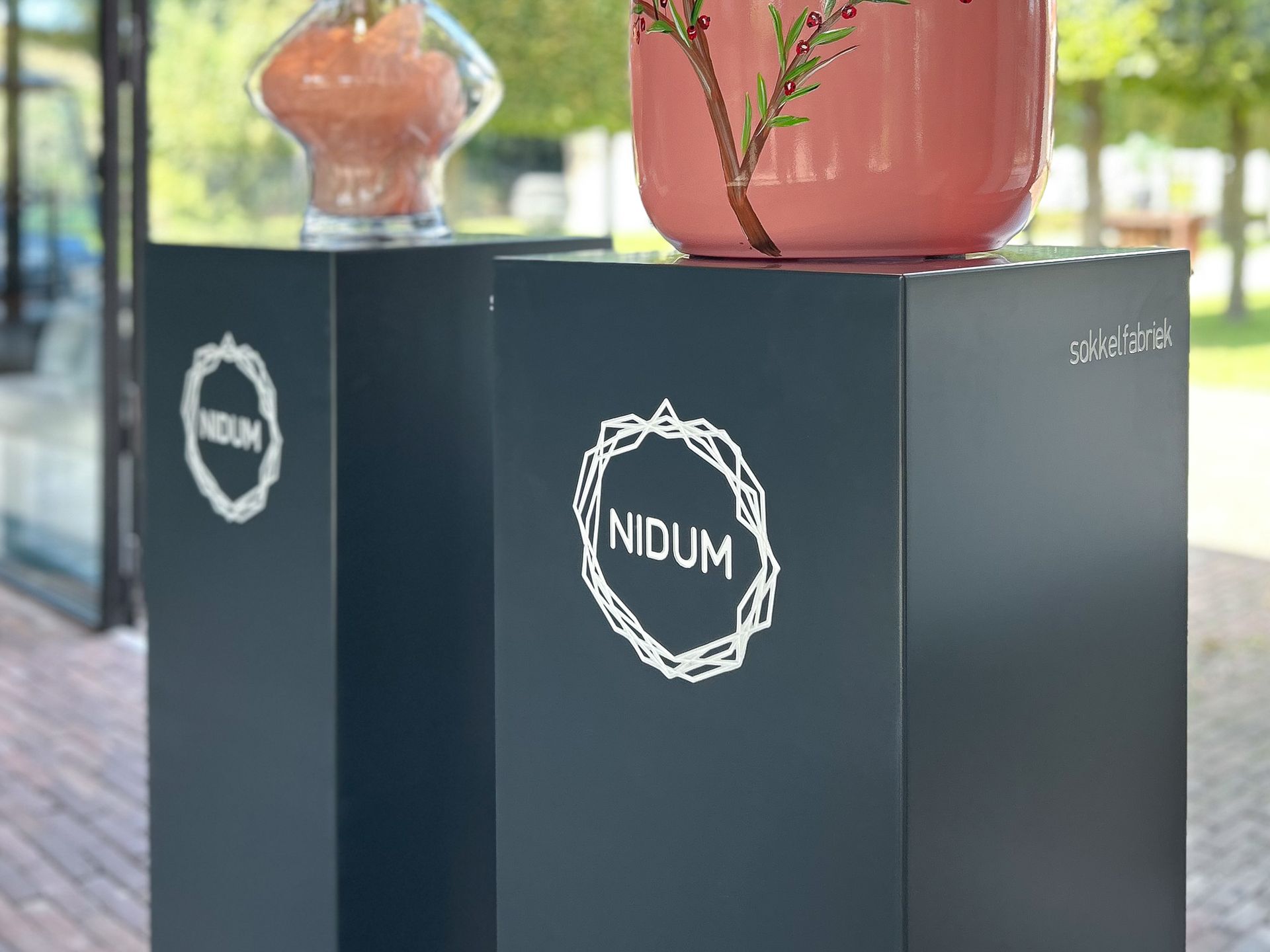 Wat deze sokkels extra bijzonder maakt, is de ingravering van de Nidum en Ovum-identiteit, zorgvuldig afgewerkt in wit. Hierdoor ontstaat een verfijnd contrast met de matte afwerking en wordt de merkidentiteit op een rustige, geïntegreerde manier zichtbaar – zonder de presentatie te overheersen.